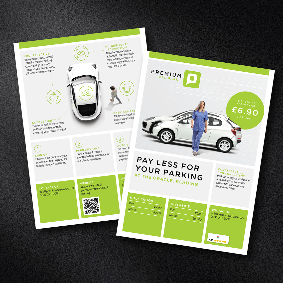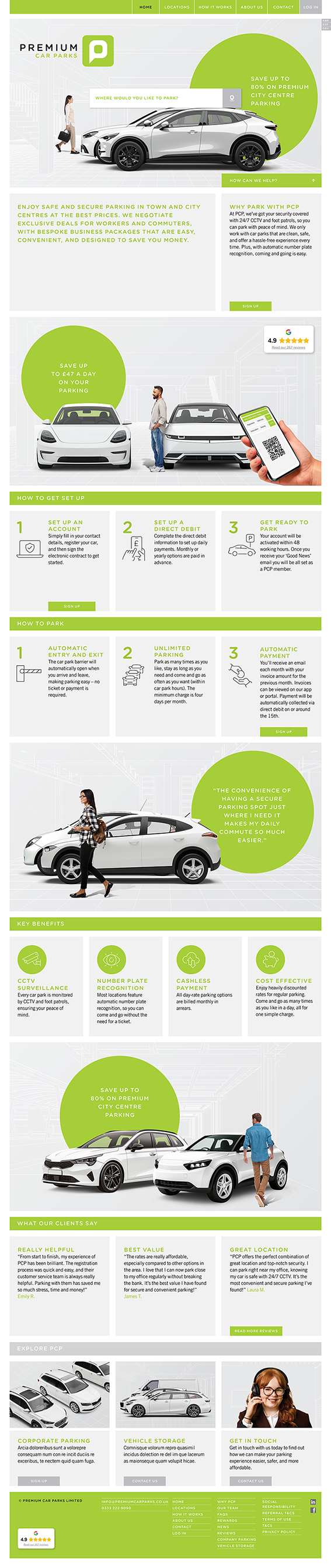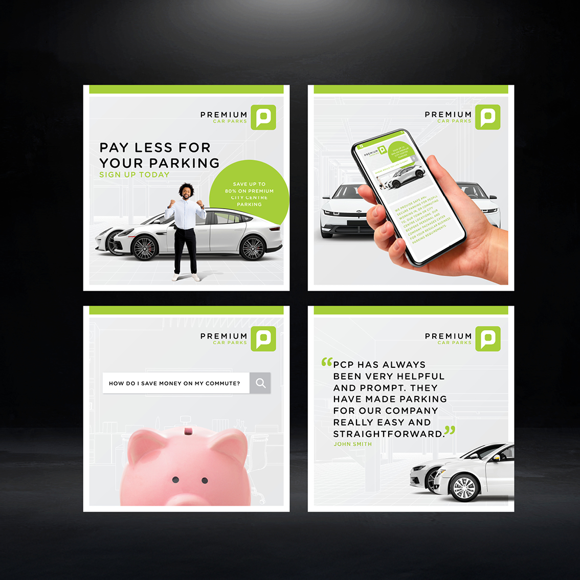 Premium Car Parking. Total rebrand, website design, social media templates and print for a revolutionary new business that offers premium parking at discounted rates.